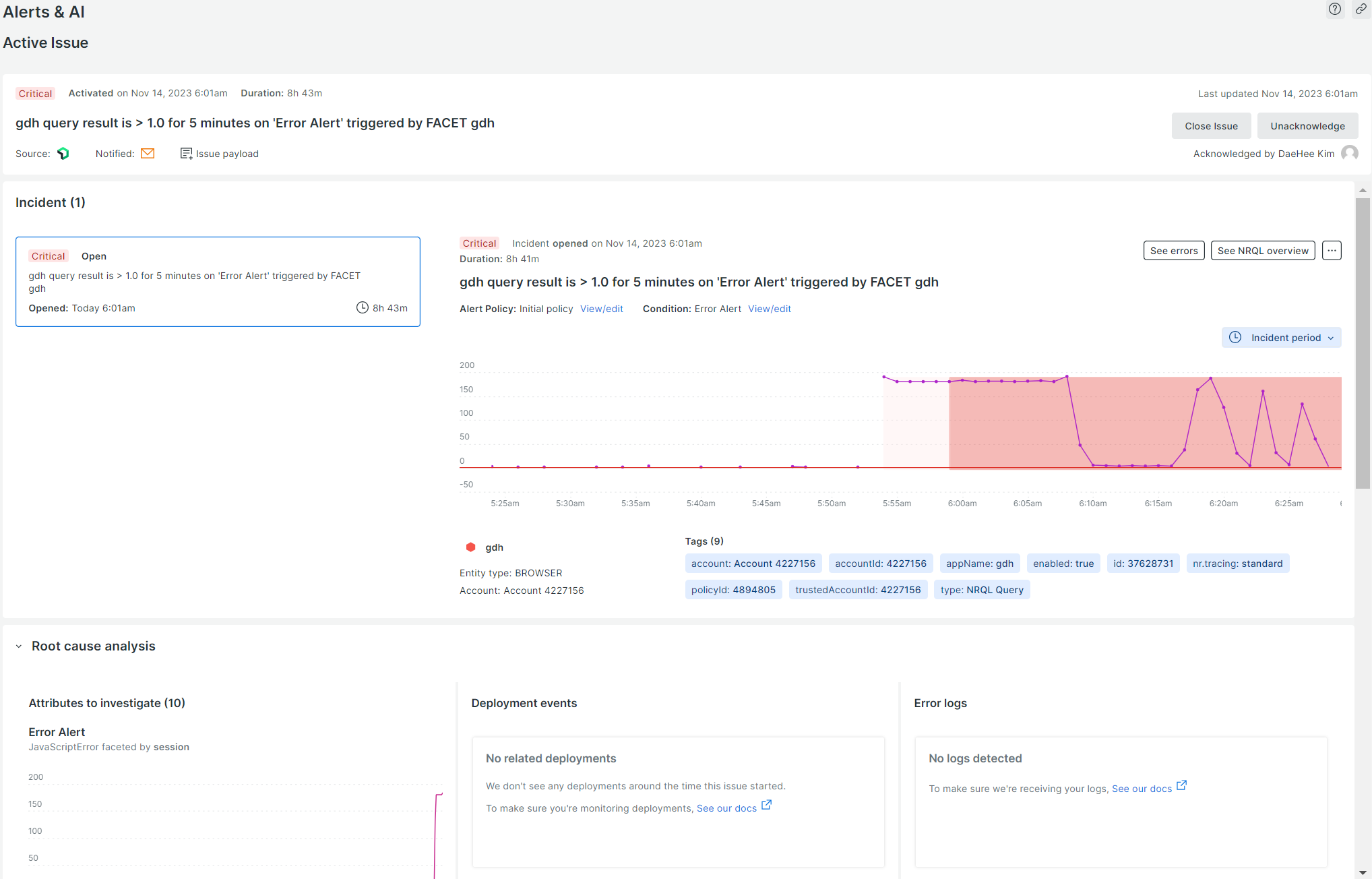- 에러 탭 > Triage 에서는 먼저 특정 기간 동안 발생한 에러에 대해 몇가지 보여주고 있다..
