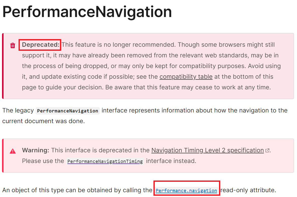 - 해당 api는 deprecated 되었며 Performance.navigation을 활용하라고 한다. (자세한 내용은 하기 링크 참고)