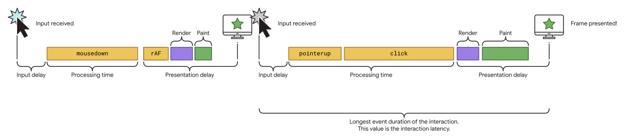 - 사용자가 페이지를 방문하는 전체 기간에 발생하는 모든 클릭, 탭, 키보드 상호작용의 지연 시간을 관찰하여 사용자 상호작용에 대한 페이지의 전반적인 응답성을 평가하는 측정항목.