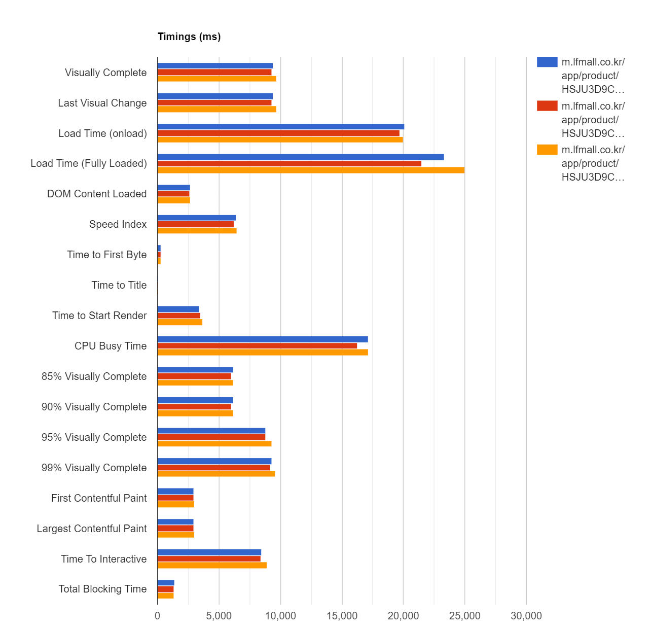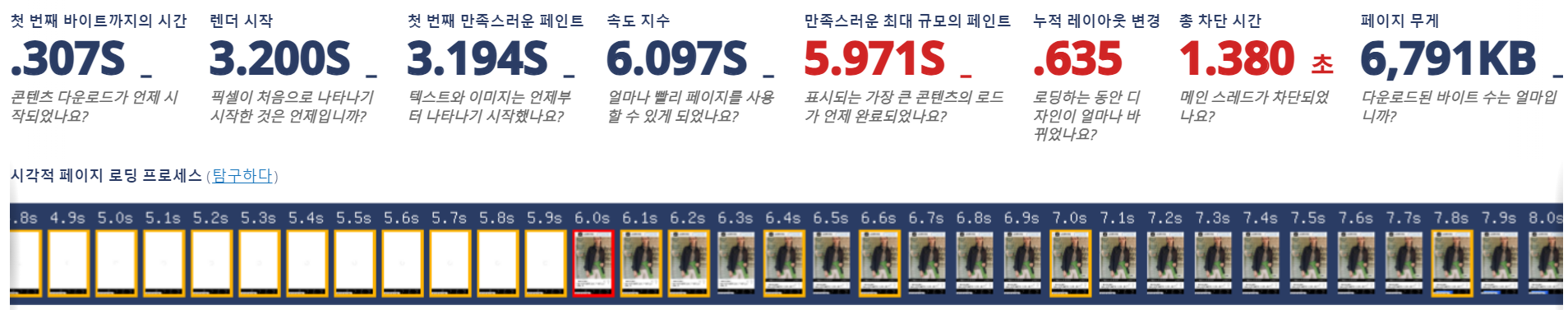 ex4) 실제 고객의 입장에서 동일한 페이지의 성능 측정 기준을 살펴 보아도 크게 차이나는것을 볼 수 있다.
