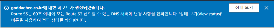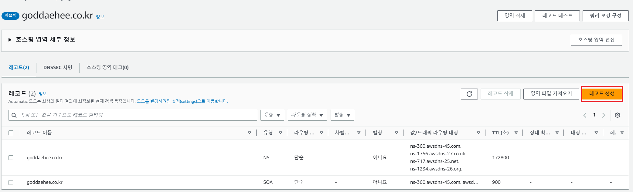 - 2번에서 등록했던 호스팅영역 상세 페이지로 이동 > "레코드 생성" 클릭.