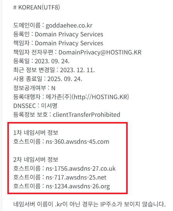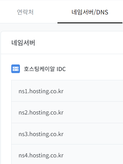ex) 호스팅 케이알 : 내가 사용하는 hosting.kr의 ns는 다음과 같다.