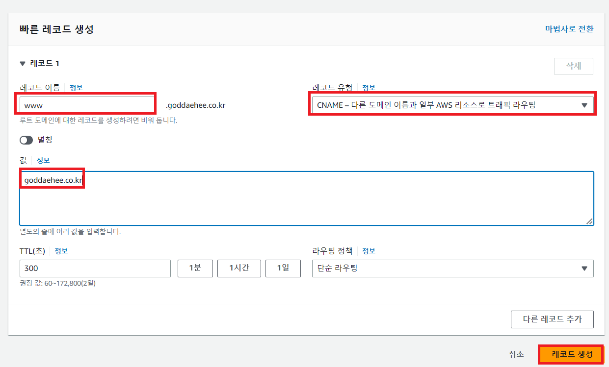 ① 레코드 이름 : 라우팅할 이름을 지정할 수 있으며, 미지정 시 기본 도메인 이름이 자동으로 설정된다.