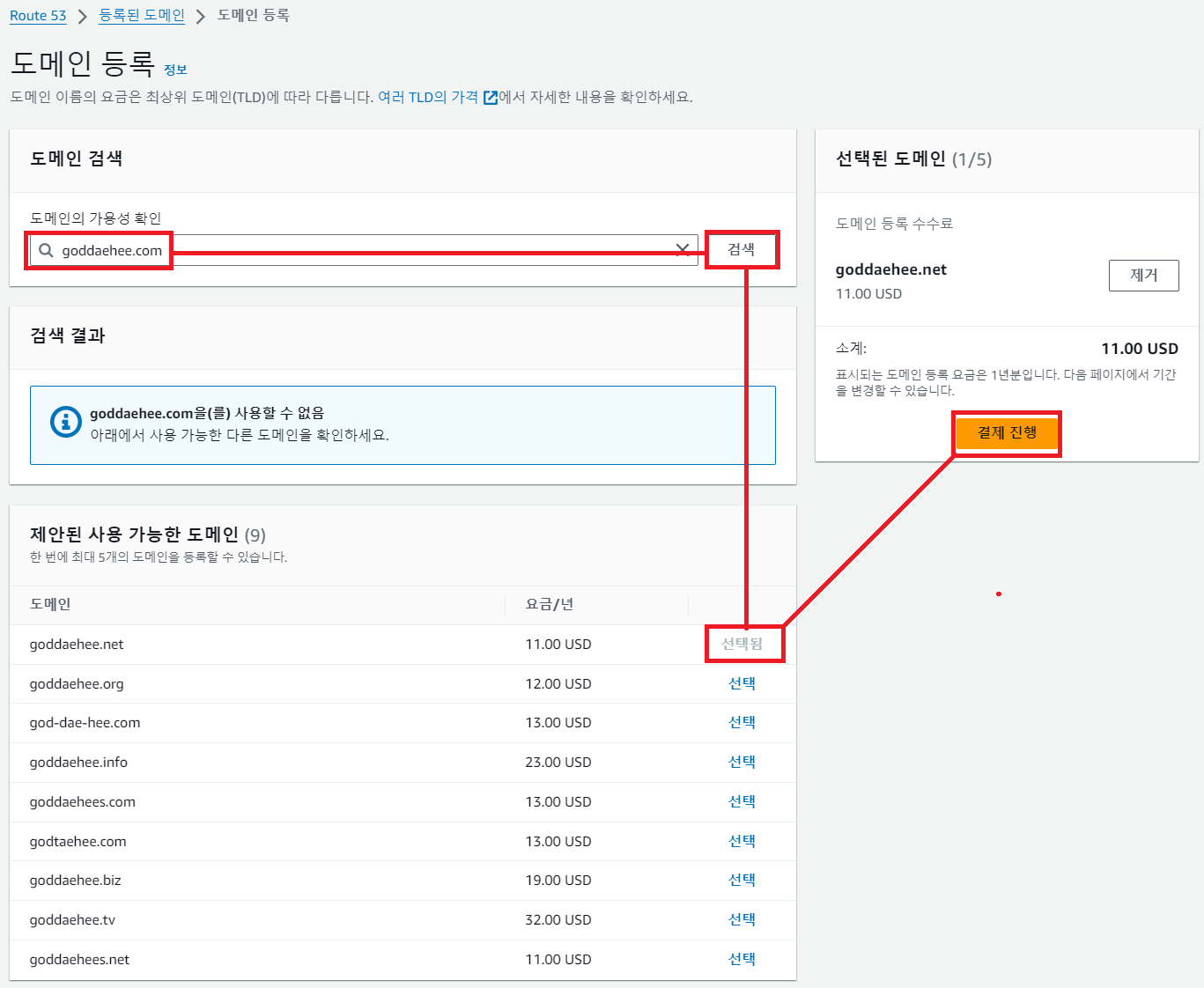 - 원하는 도메인명 입력 > 검색 > 원하는 도메인 선택 > 결제 진행 클릭.