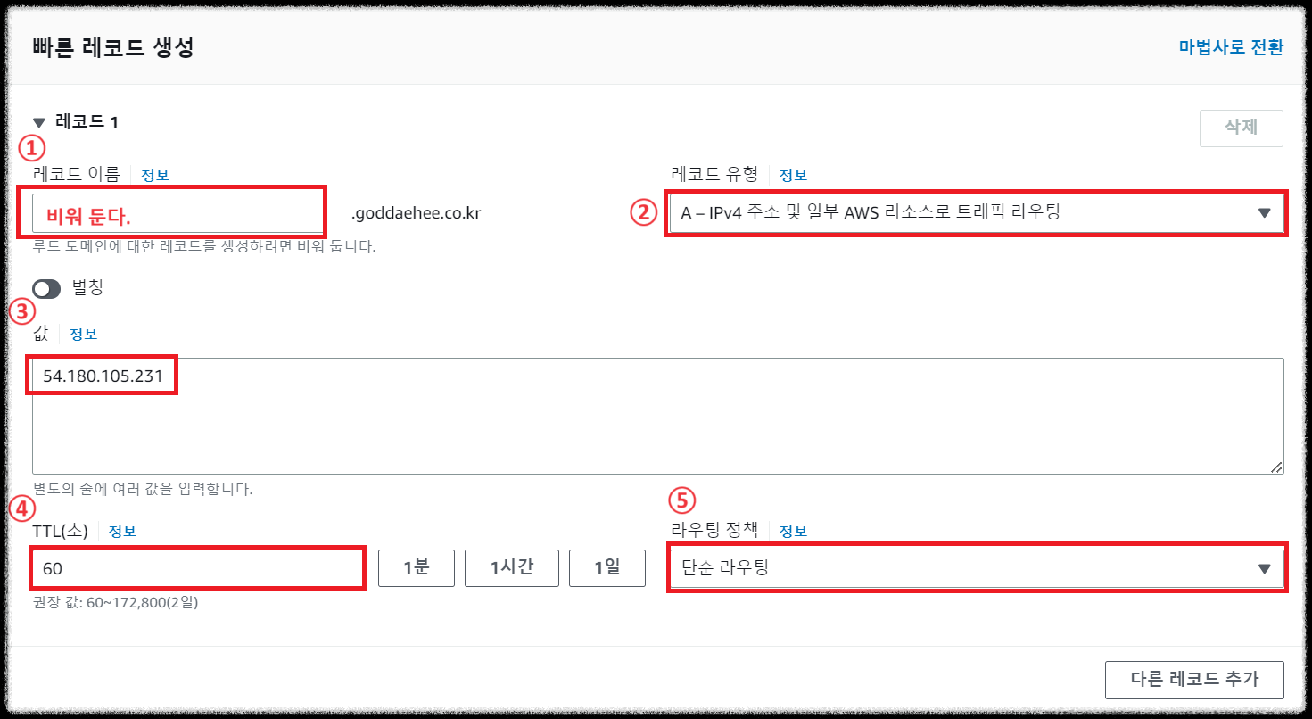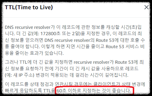 ④ TTL : DNS에 해당 레코드, ip주소를 캐싱할 시간(초) 이다. 상태점검( health check ) 기능을 사용할 경우 AWS에서는 60초 이하를 권장한다.