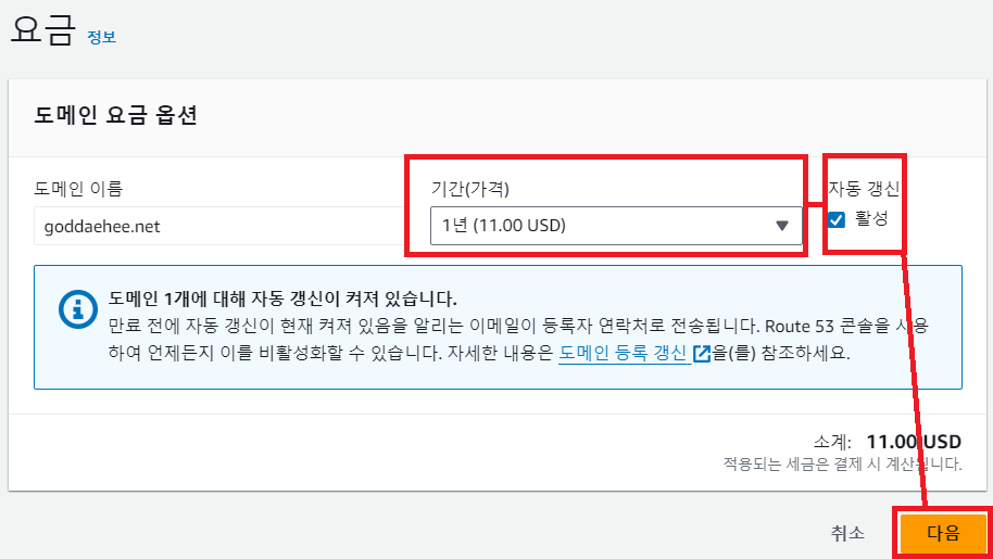 - 기간 선택 > 자동갱신 여부 체크 후 > 다음 클릭.