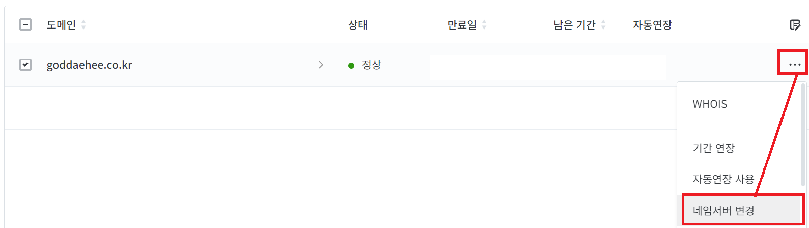 ※ 외부 도메인 제공 업체에서 네임 서버 값 변경 - 다시 본인의 dns 관리 페이지로 이동하자. (나의 경우 hosting kr 이다.) > 네임서버를 변경 할 도메인을 선택, "네임서버 변경" 클릭.