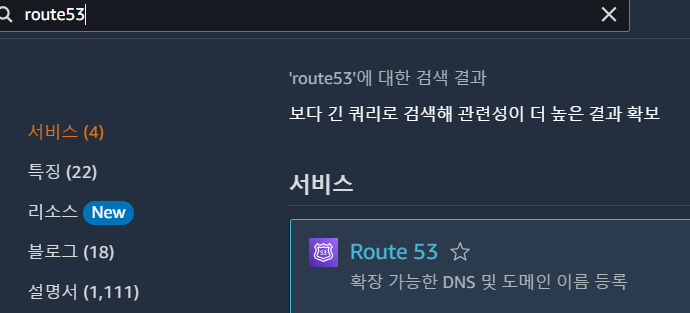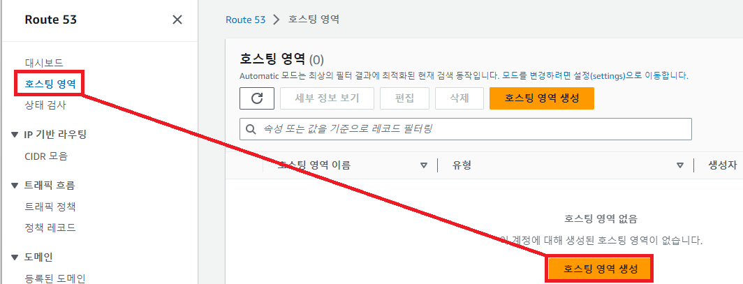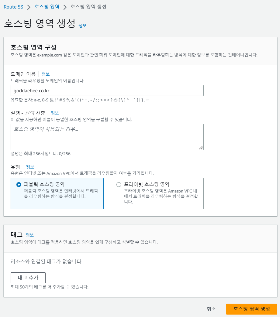 - Route53 콘솔 > 호스팅 영역 > 호스팅 영역 생성 클릭.