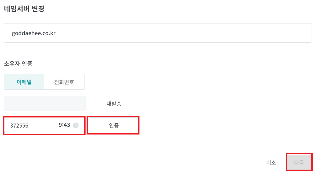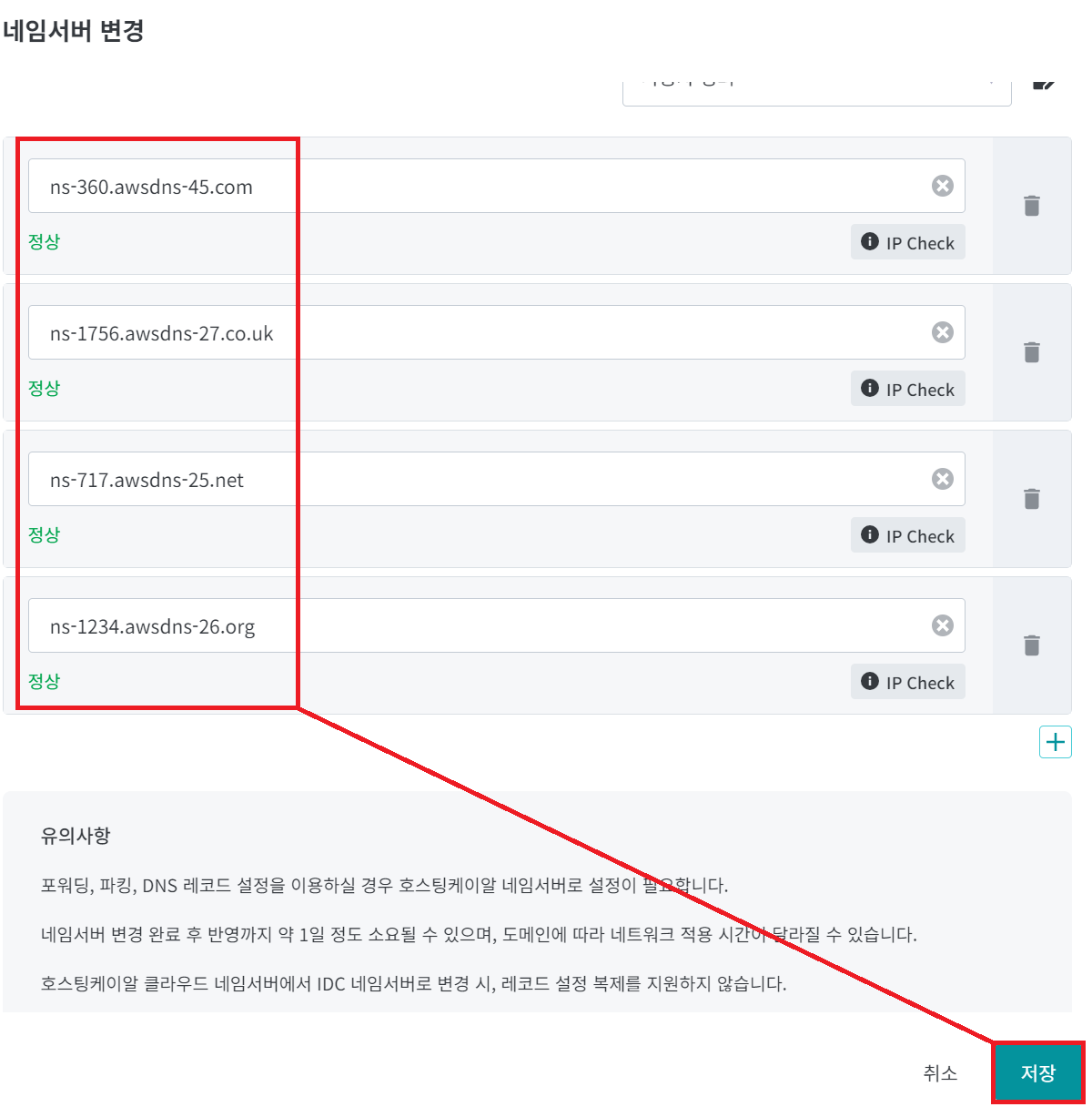 - 다음과 같이 되어있는 네임서버를 route53에서 확인하였던 ns로 변경 하자.