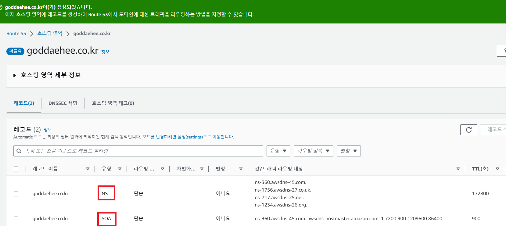 - NS와 SOA 가 생성된 것을 볼 수 있다.