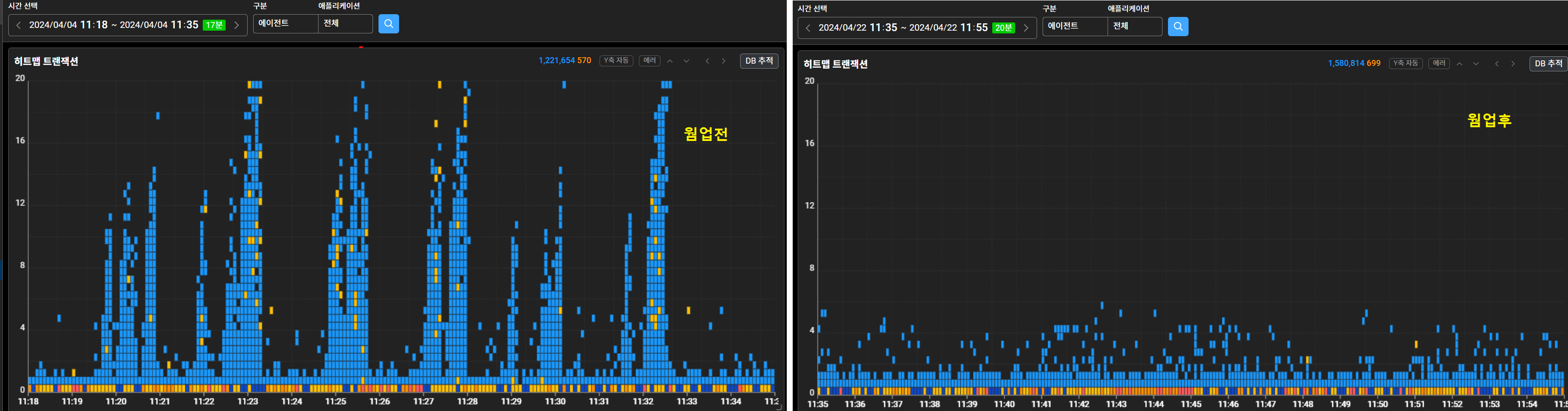- case2) 트래픽이 많은 11시 비정기 배포때의 예시 ( 좌측 : 웜업 적용 전 / 우측 : 웜업 적용 후)