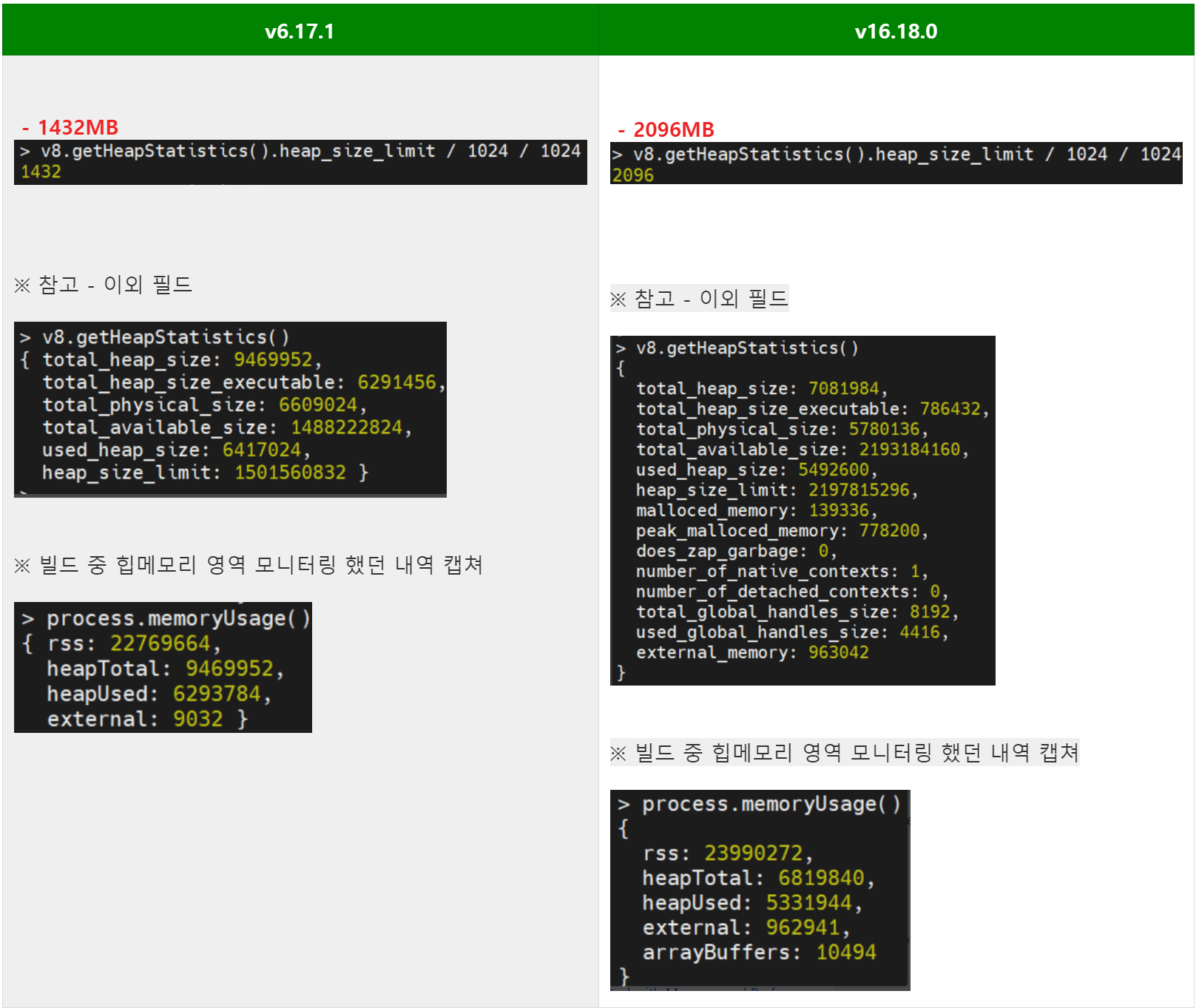 - 각각의 서버에서 확인한 node Version별 default heap_size_limit.