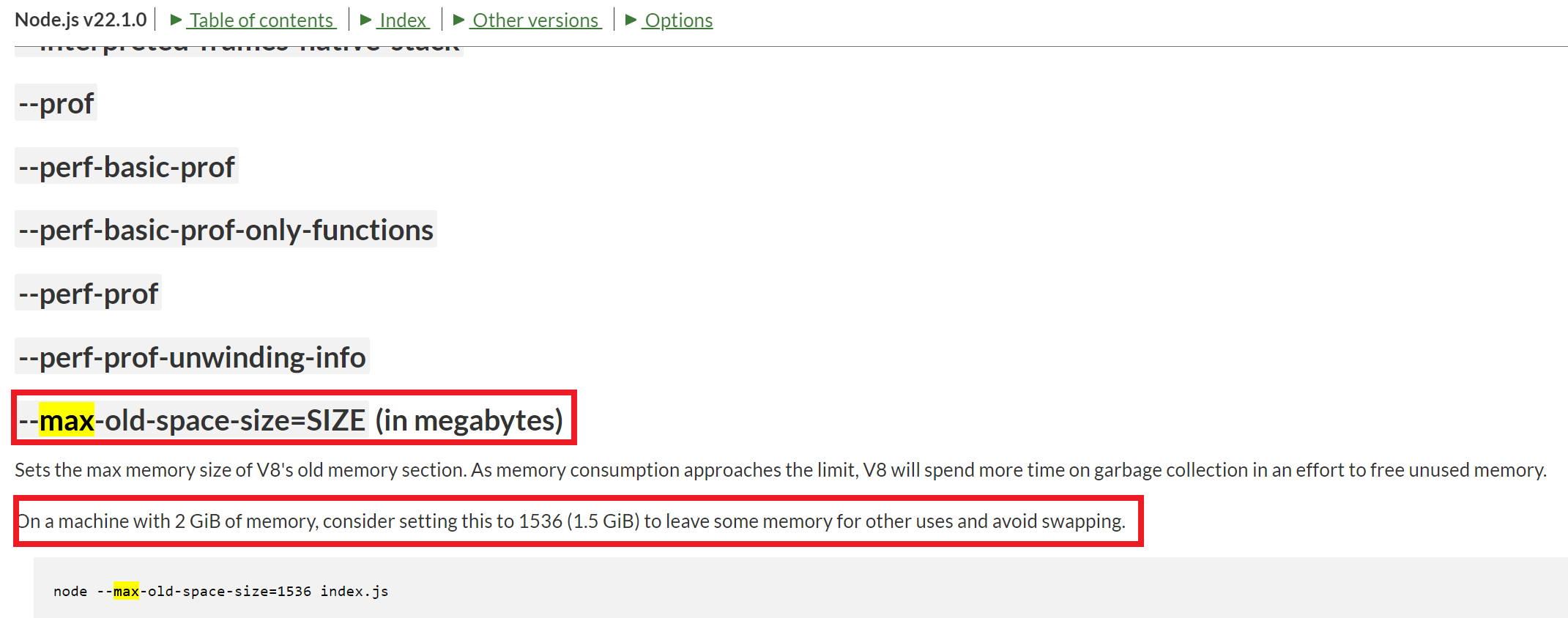 ex) nodeVersion 22v 기준으로 만약 2GB의 Server에서는 약 0.5GB를 여유를 두고 1.5GB로 제한하는 가이드를 확인할 수도 있다.