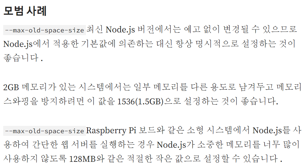 - 노드의 메모리 제한을 조정하여 해결 가능하다. (물론 메모리를 많이 사용하지 않도록 소스레벨에서 최적화하는 것이 좋다.)