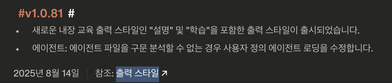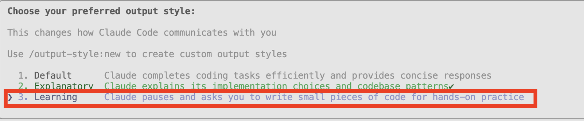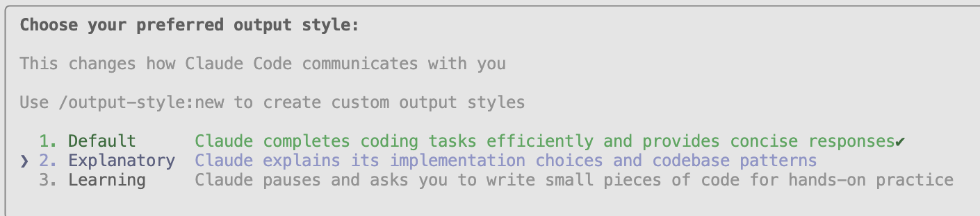 `/output-style` 명령어로 Default, Explanatory, Learning 모드를 선택할 수 있게 되었다.
