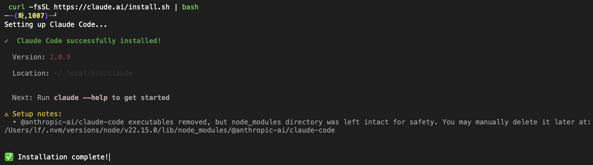 Claude Code 2.0부터는 설치가 더욱 간편해졌다. Native Installer가 새로 추가되어 자동 업데이트까지 지원한다.