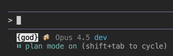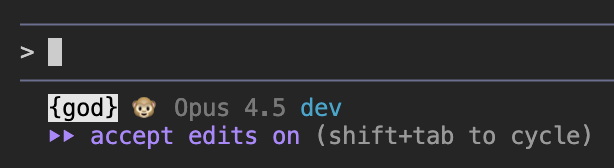 "command": "input=$(cat); emojis=(⚡️ 🔥 🇰 👑 😎 🐸 🐵 🦄 🌈 🍻 🚀 💡 🎉 🔑 🚦 🌙); emoji=${emojis[$((RANDOM % ${#emojis[@]}))]}; cwd=$(echo \"$input\" | jq -r '.workspace.current_dir'); model=$(echo \"$input\" | jq -r '.model.display_name'); printf \"\\033[30;47m{god}\\033[0m %s \\033[2m%s\\033[0m \\033[36m%s\\033[0m\" \"$emoji\" \"$model\" \"$(basename \"$cwd\")\""