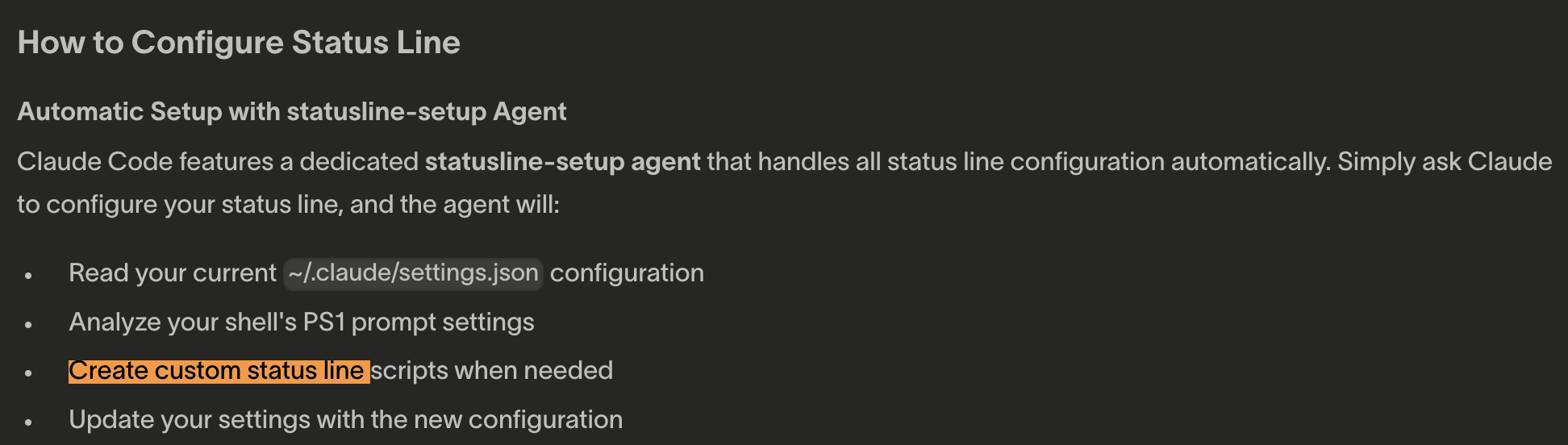 > 공식 문서에 확인해보면 ~/.claude/settings.json에 statusLine 객체를 추가 한다라고 되어있으니 갱신여부도 살펴보자.