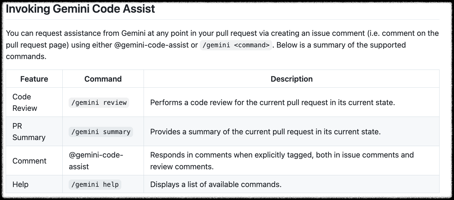 PR 댓글에서 `/gemini` 태그를 사용하면 실시간으로 질문하고 답변받을 수 있다.
