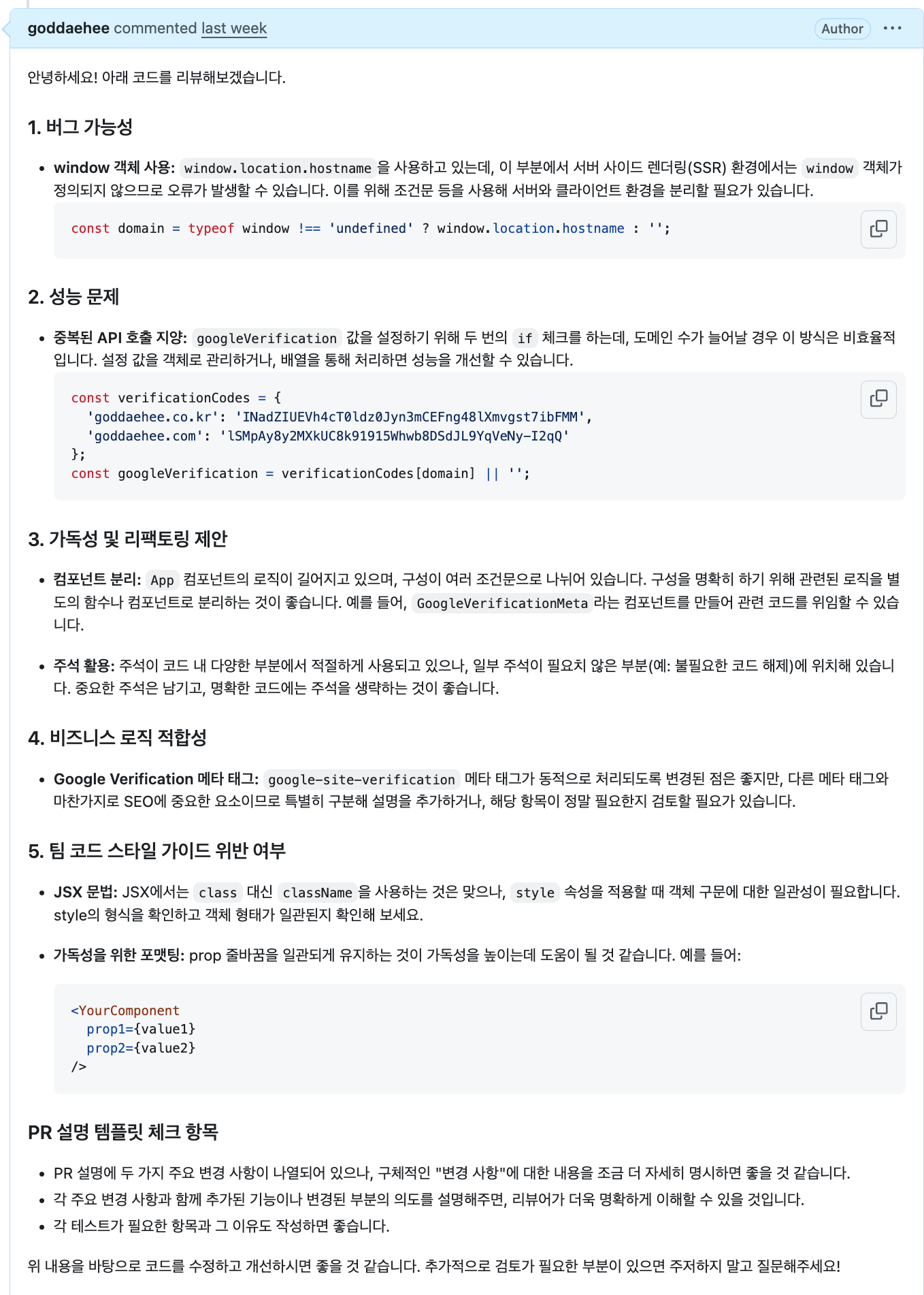 - 내가 간단하게 5가지 관점에 대해 프롬프팅을 작성하여 전체 리뷰 요청한 결과.