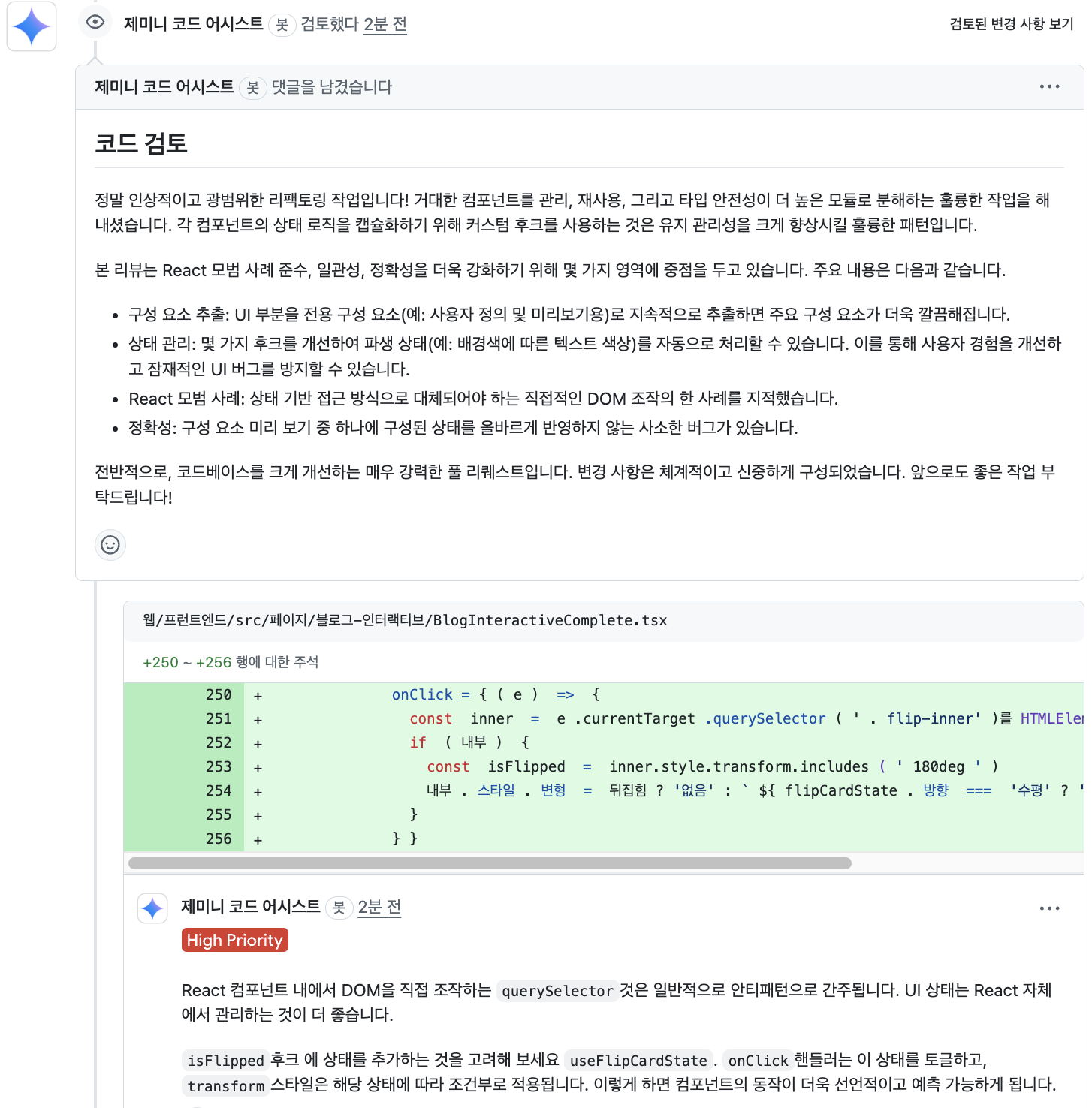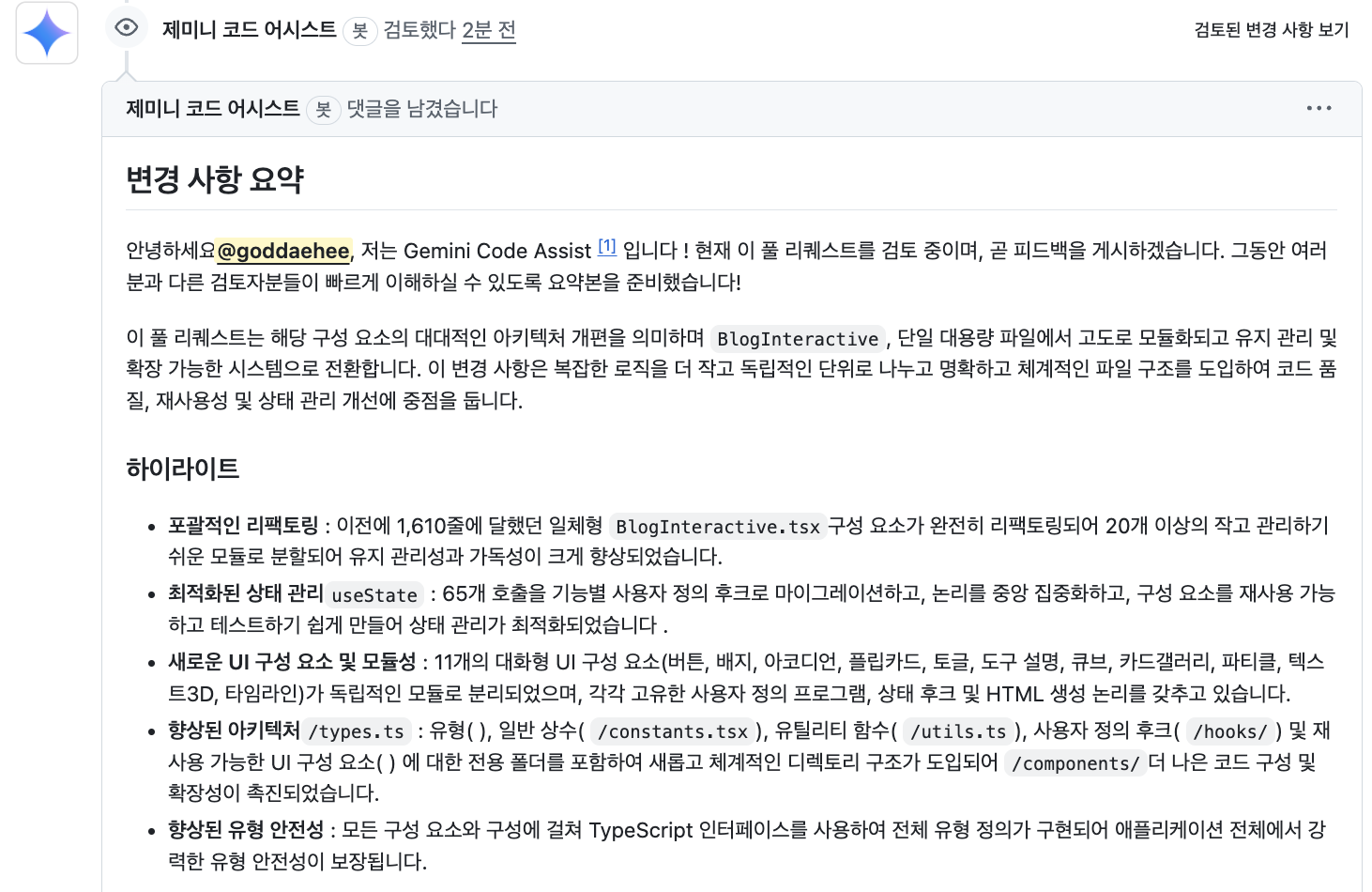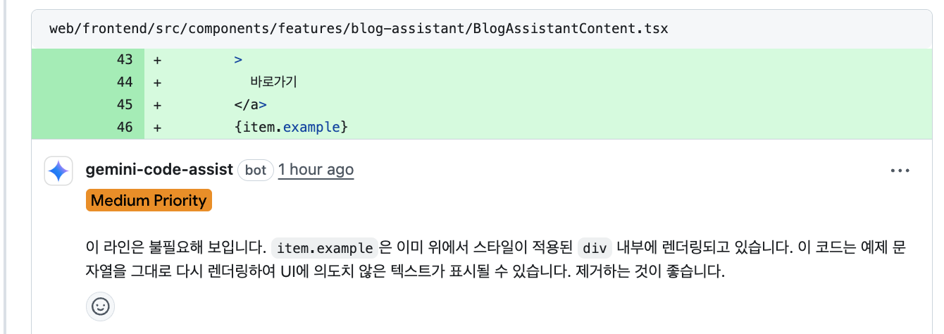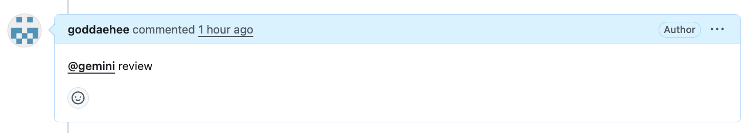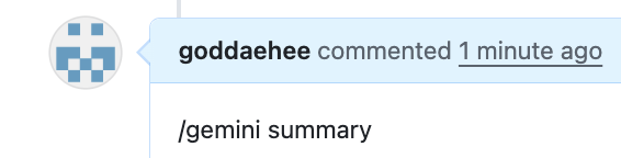 - comment기능을 통해 요청해볼 생각이다. @gemini-code-asssis 라고 호출하라고 되어있는데 그냥 @gemini review ~ 라고 호출해도 일단 동작 되며, 이미 열려 있던 pull request 에서 수동으로 호출하여 리뷰 요청을 해보았다. (조금 이미지가 길어질 수 있지만 전체 내용 캡쳐 )