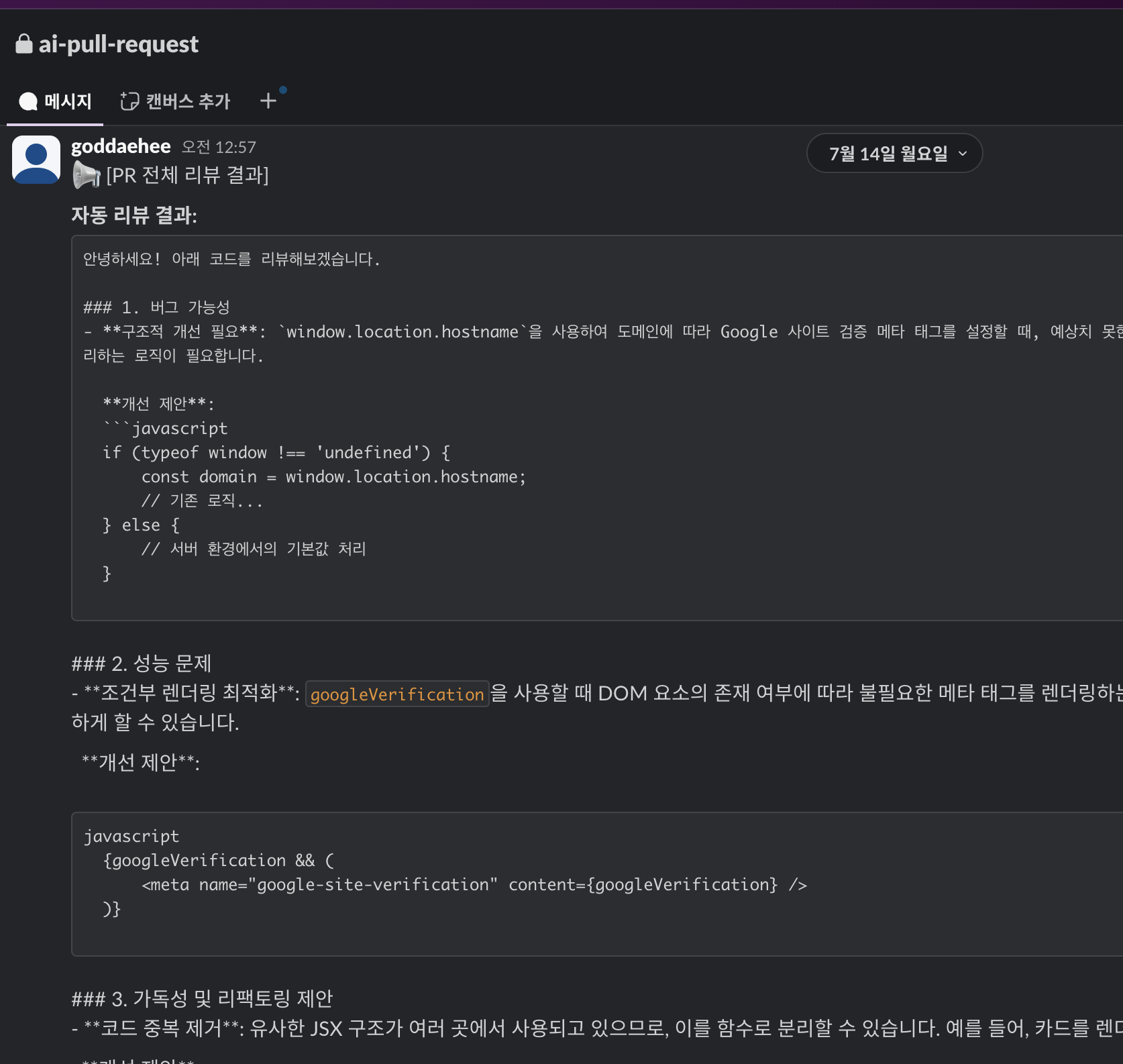 - 잠깐 내가 설정해둔 커스텀 PR 리뷰 봇과 (n8n + gpt 를 통해 자동 리뷰 하는 기능 테스트를 진행했었다.) 비교 해보고 넘어 가자.