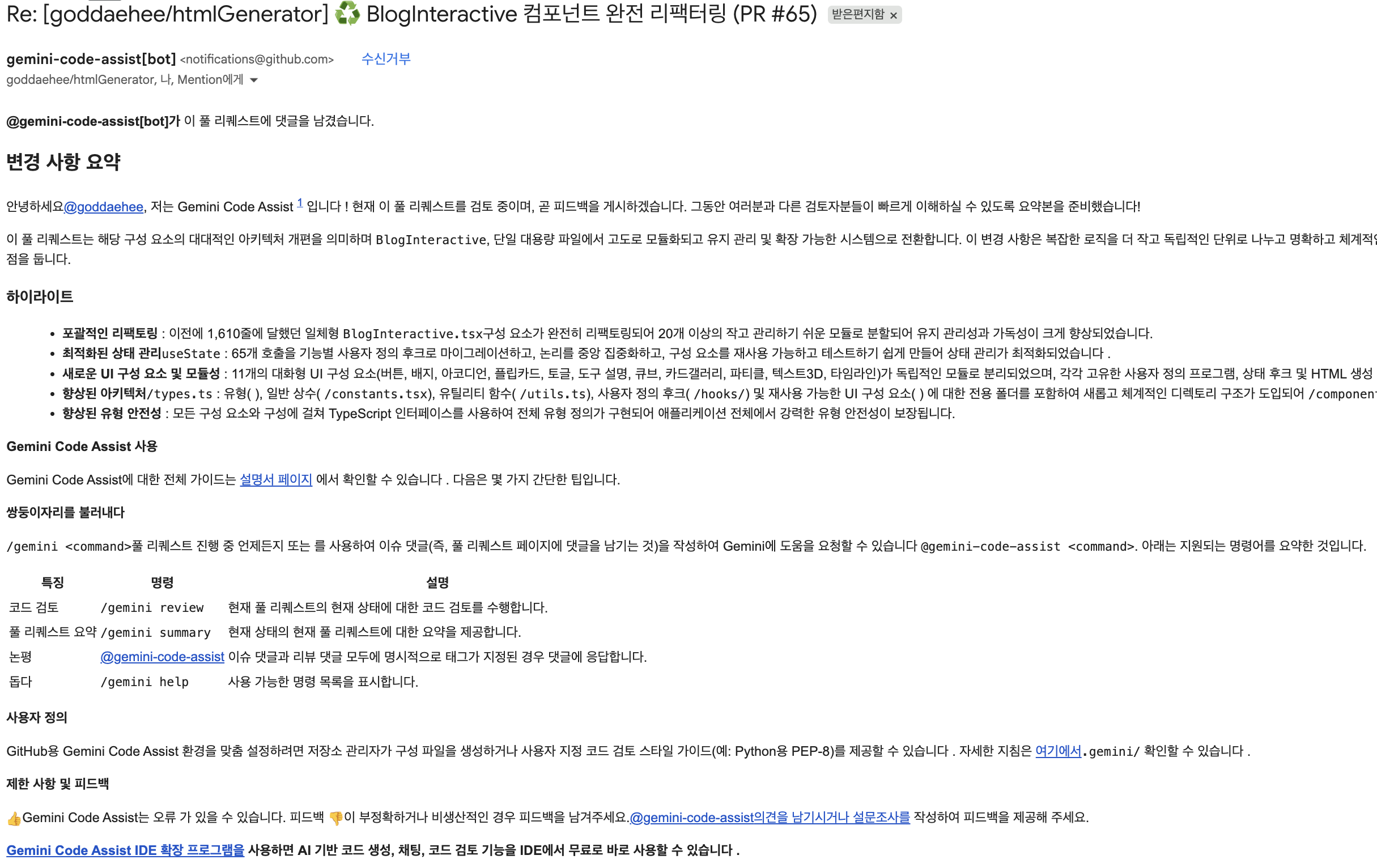 - 인터랙티브 피드백: /gemini 태그로 언제든 추가 질문 가능