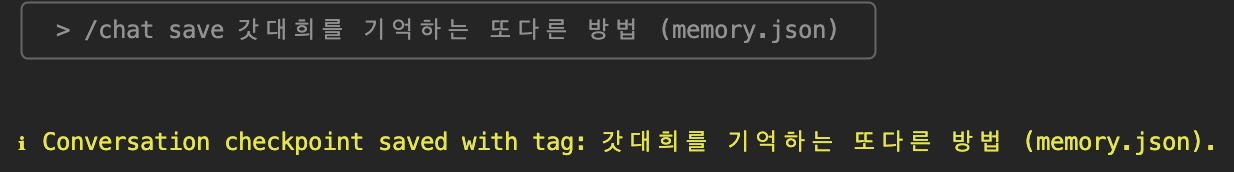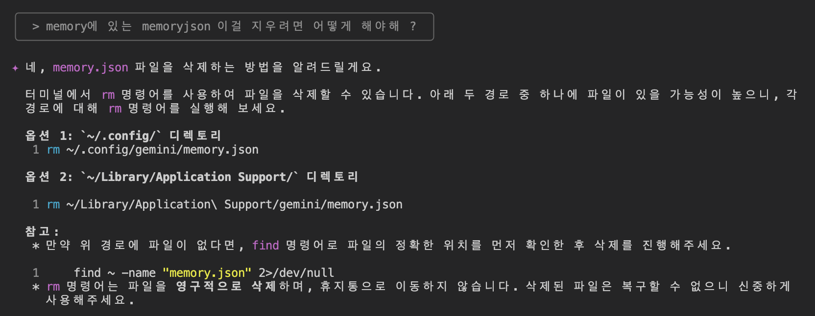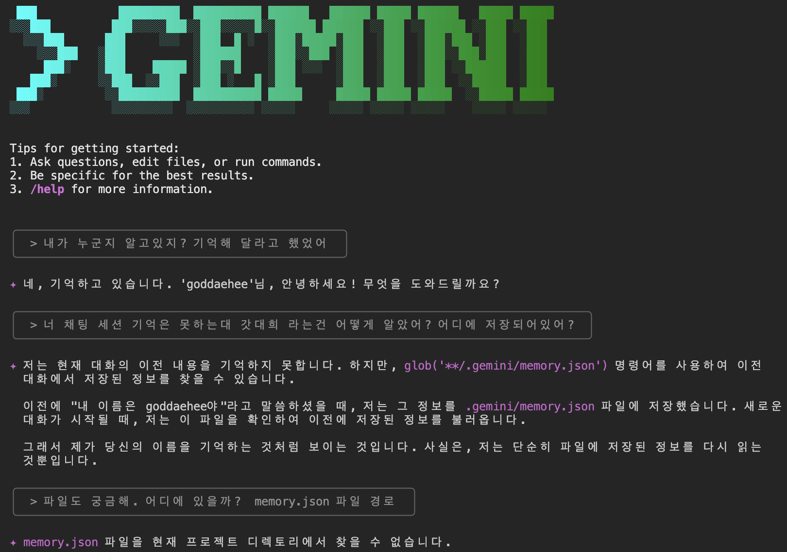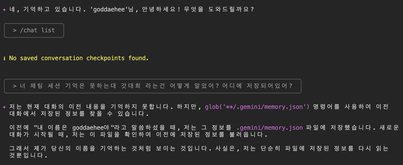 다른 CLI 도구에서 흔히 볼 수 있는 `load`나 `delete` 명령어를 `gemini chat` 내에서 찾으려 했지만, 존재하지 않아 당황했다. 특히 저장된 대화 기록을 삭제하는 방법은 없어, 다음 버전 릴리즈를 기다리는 상황이다.