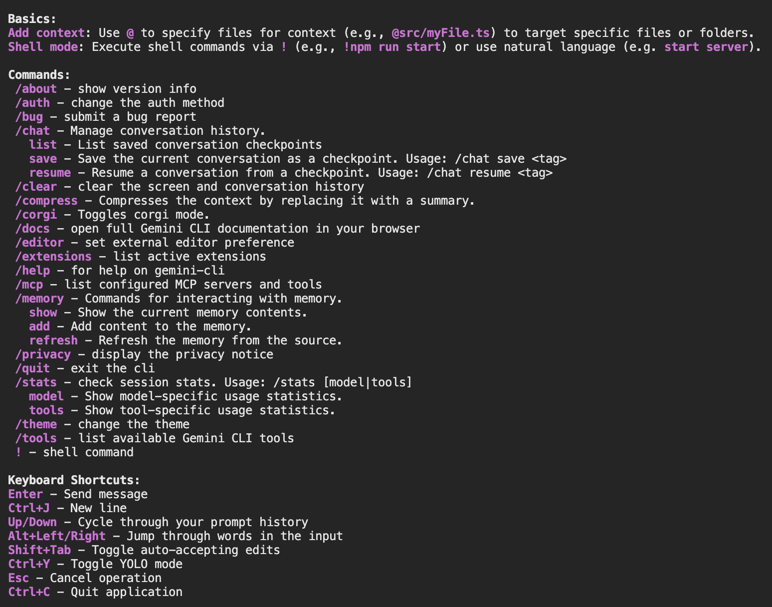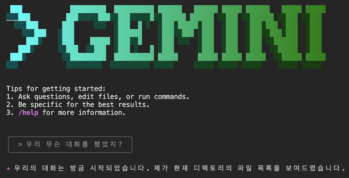 여기서 `Gemini >` 프롬프트에 자연어로 명령을 입력하거나 슬래시 명령어를 사용할 수 있다.