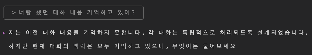 - Gemini는 기본적으로는 이전 대화 내용을 기억하고 있지 않다.