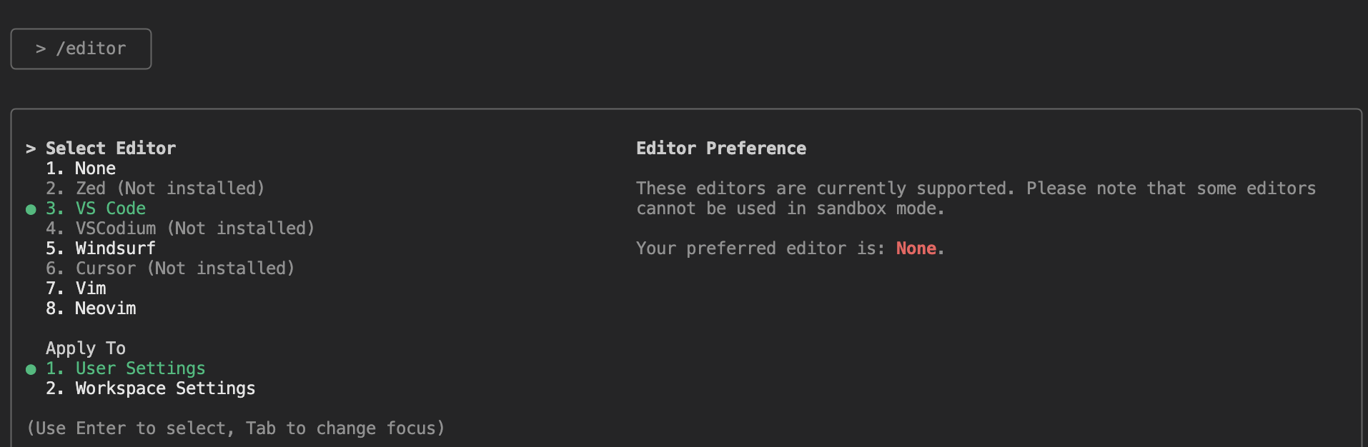 ex) /editor - Gemini CLI가 파일을 수정할 때 터미널 내에서 처리하지 않고, 설정한 외부 에디터로 파일을 열어서 작업할 수 있다.