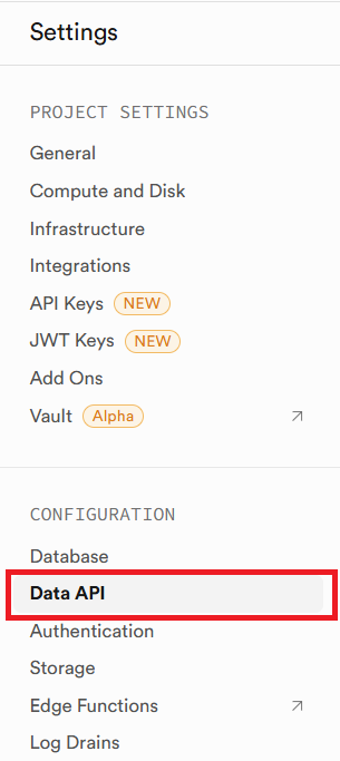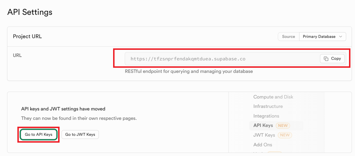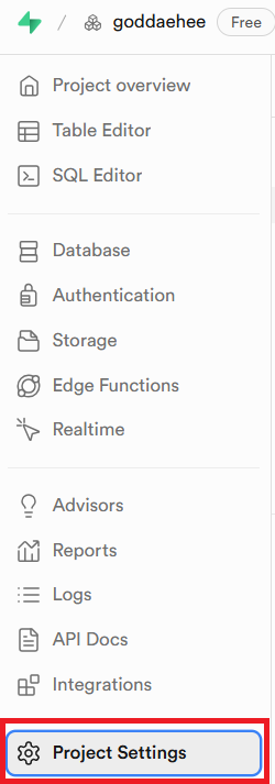 - 프로젝트 생성 완료 후 좌측 사이드바에서 Project Settings → API 메뉴 클릭