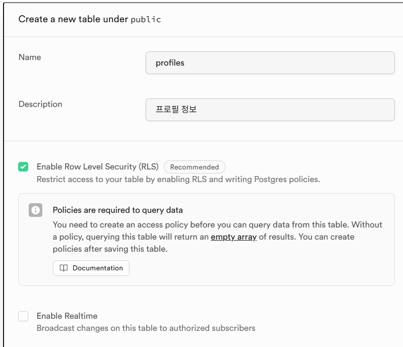 - 테이블 이름 : profiles 입력 - Enable Row Level Security (RLS) 체크박스 ON (보안상 중요!)