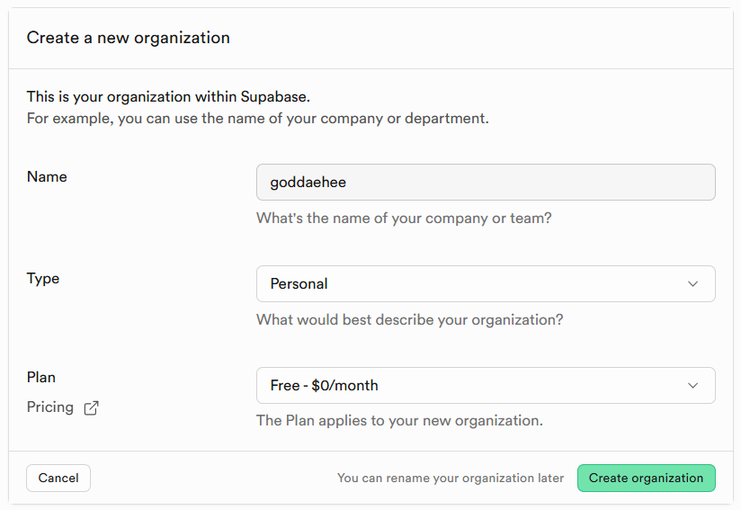- Organization 선택: 개인 계정이면 자동으로 생성된 조직 선택