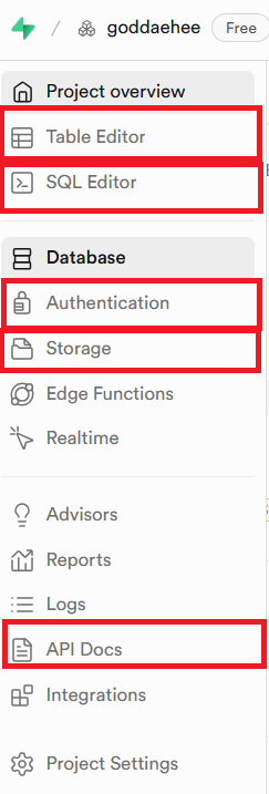- API Docs (API 문서): 생성된 프로젝트의 API 엔드포인트와 사용 예시 코드를 자동으로 생성하여 보여준다. 클라이언트에서 Supabase를 연동할 때 이 문서를 참고하면 된다.