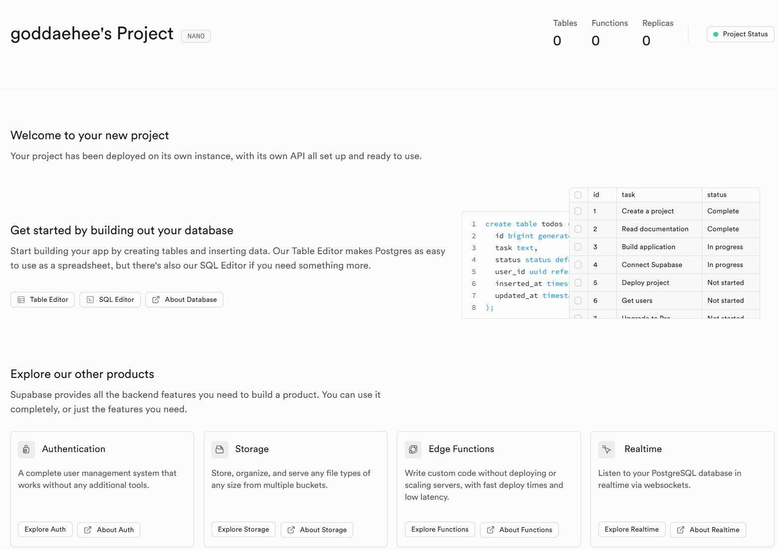 프로젝트가 생성되면 Supabase 대시보드로 이동한다.