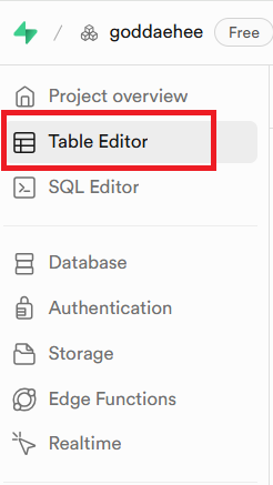 - Table Editor (테이블 편집기): 데이터베이스의 테이블을 시각적으로 생성하고 데이터를 CRUD(Create, Read, Update, Delete) 할 수 있는 곳이다. 초기 데이터 입력이나 간단한 쿼리에 유용하다.