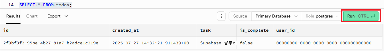 'Table Editor'에서 'todos' 테이블을 선택한 후, 'Insert row' 버튼을 클릭하여 데이터를 직접 추가하거나, 아래와 같이 SQL Editor에서 쿼리를 실행할 수 있다.