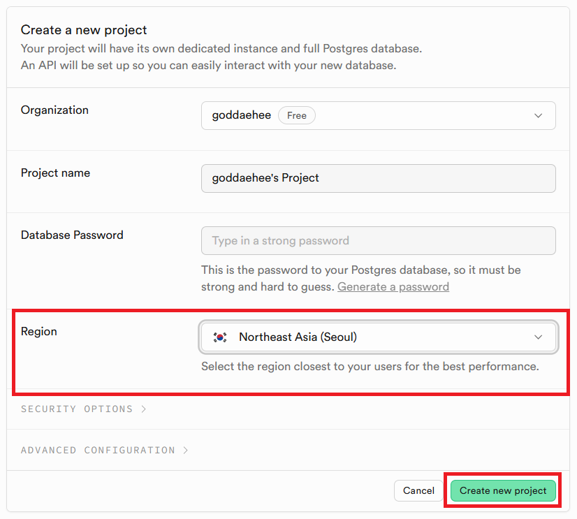 - 인증 완료 후 조직 설정 및 프로젝트 설정 / Region은 한국으로 선택하여 진행