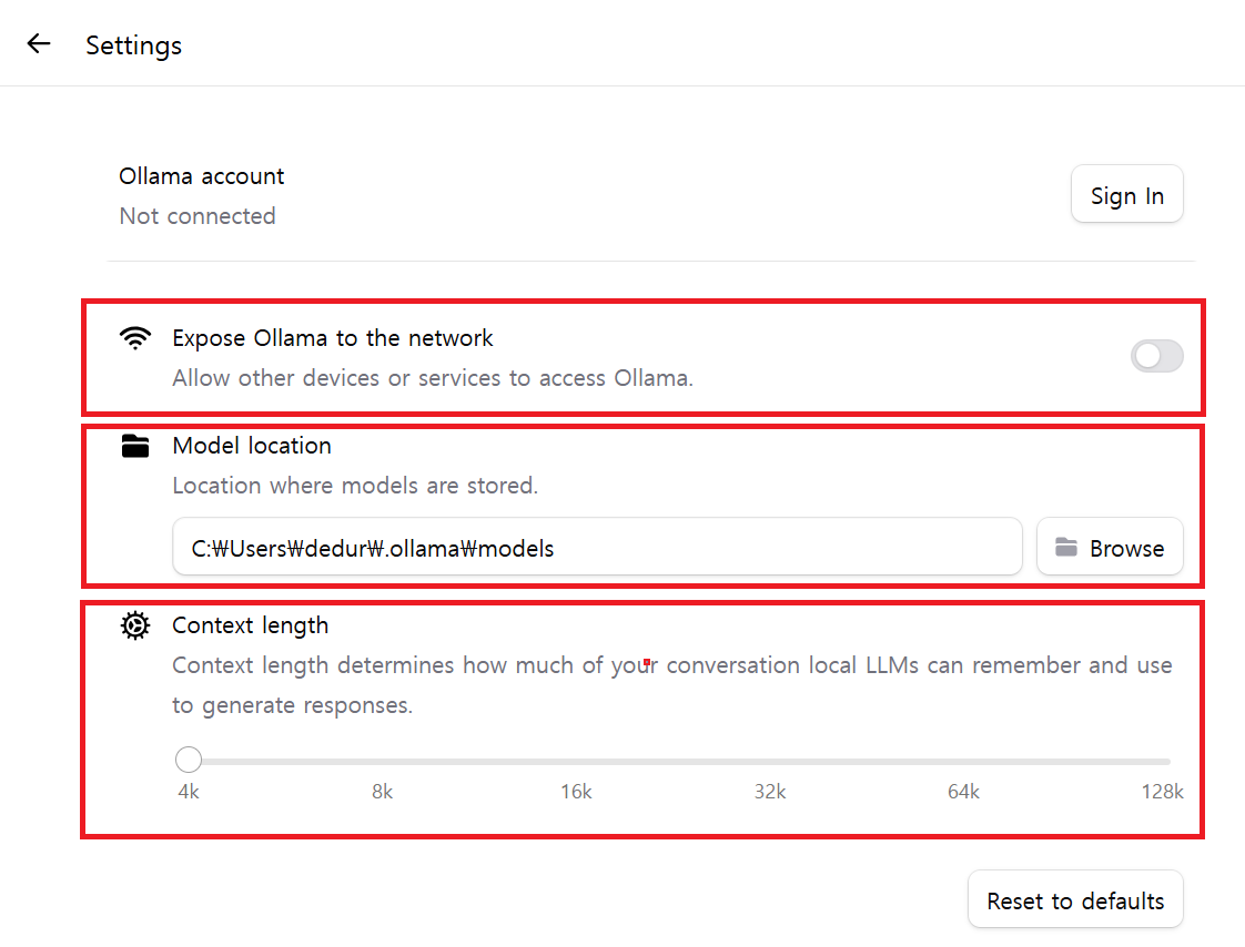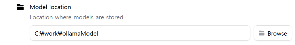 Model location (모델 저장 위치) : Ollama가 다운로드하고 저장하는 LLM 모델 파일들의 폴더 경로를 지정