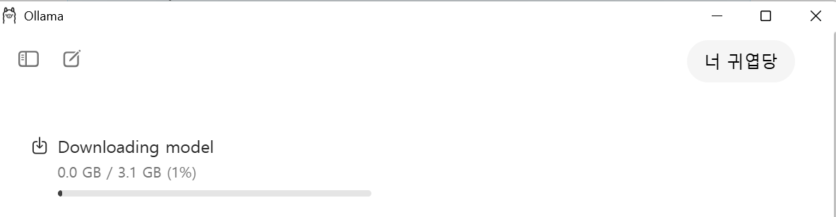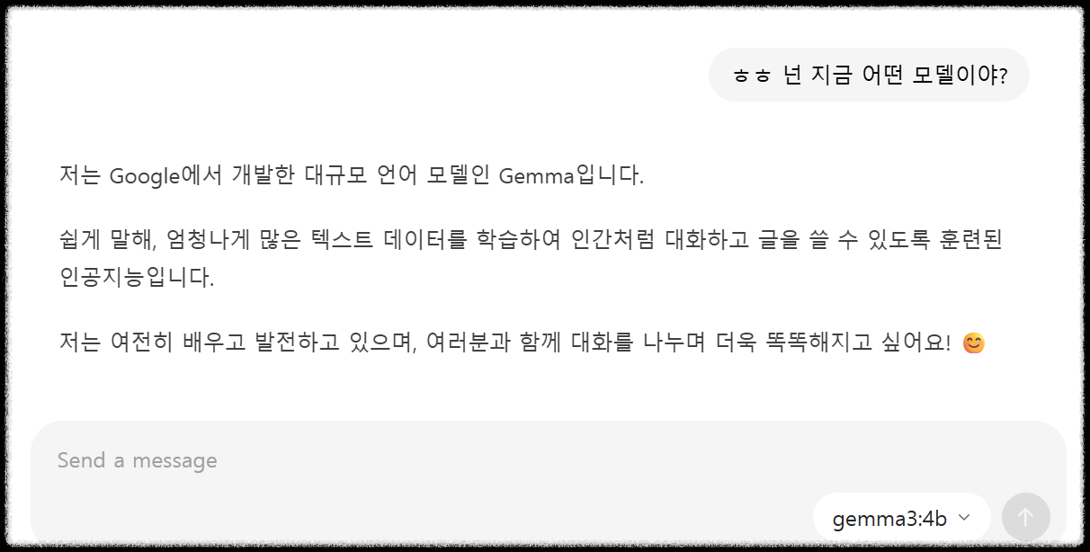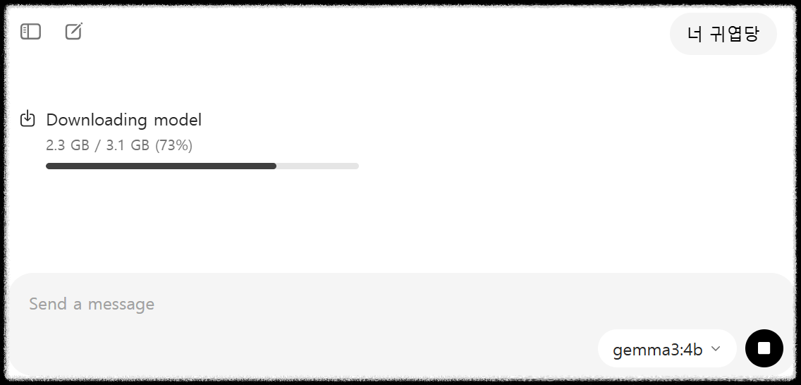- default로 설정되어있는 gemma3:4b가 한계이지 않을까? CLI 방식으로 다운로드 해도 되고 GUI로 채팅을해도 알아서 다운로드를 시작한다.