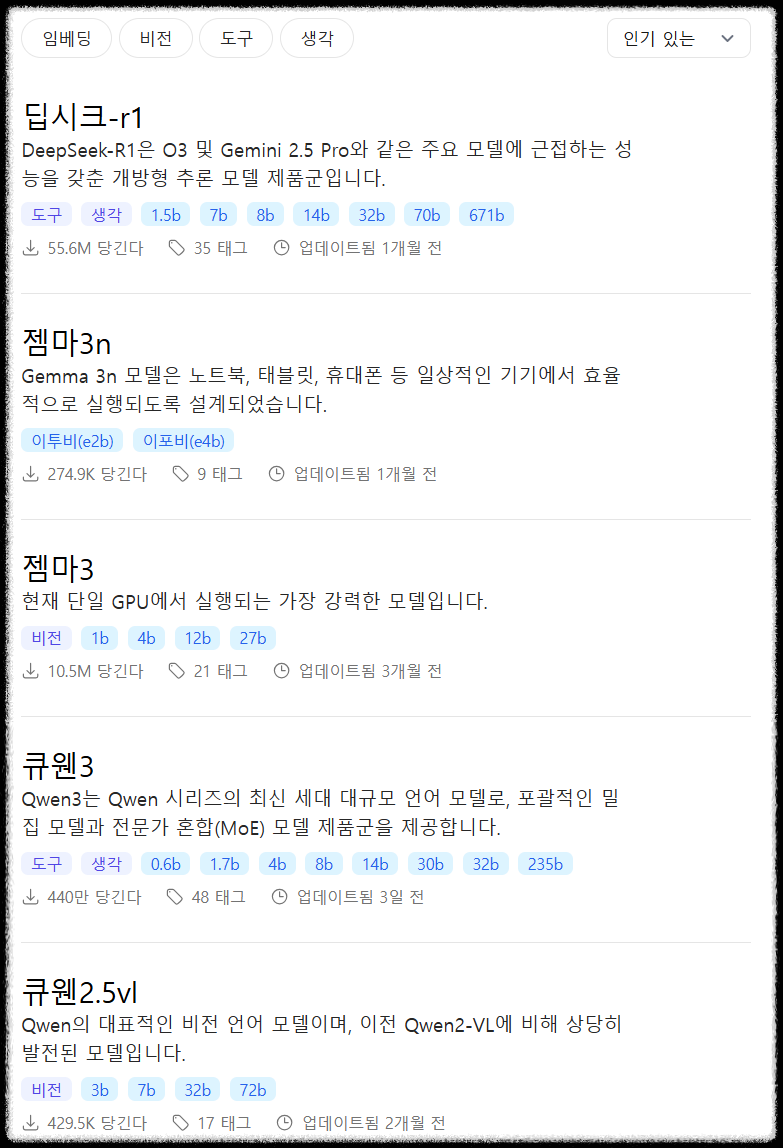 - 최신 모델 지원 : Llama 3.2, DeepSeek-R1, Phi-4, Gemma 3 등 최신 모델들까지 지원