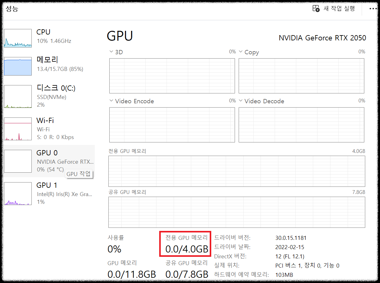 - 내 pc의 GPU를 확인해 보면 전용 GPU 메모리(VRAM)가 4.0GB 인것을 확인할 수 있다.