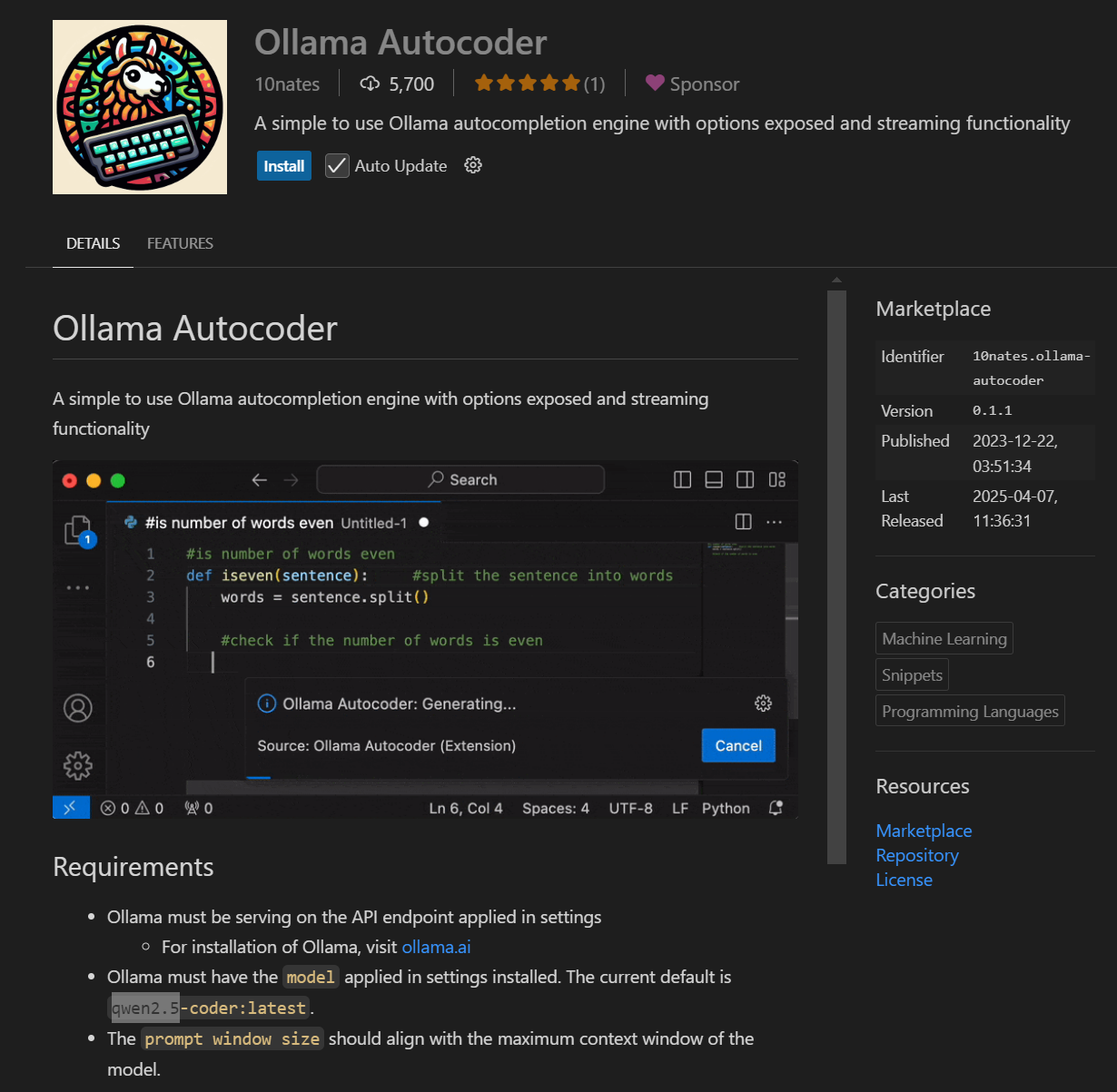 - 당장의 예시는 코드를 작성하면 ollama가 자동으로 소스를 완성해주거나 추천해주는 기능이다