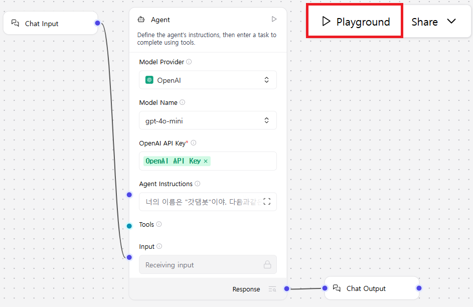 - 이 모델의 OpenAI API key 필드를 클릭해서 본인의 OpenAI API Key를 세팅해주자.