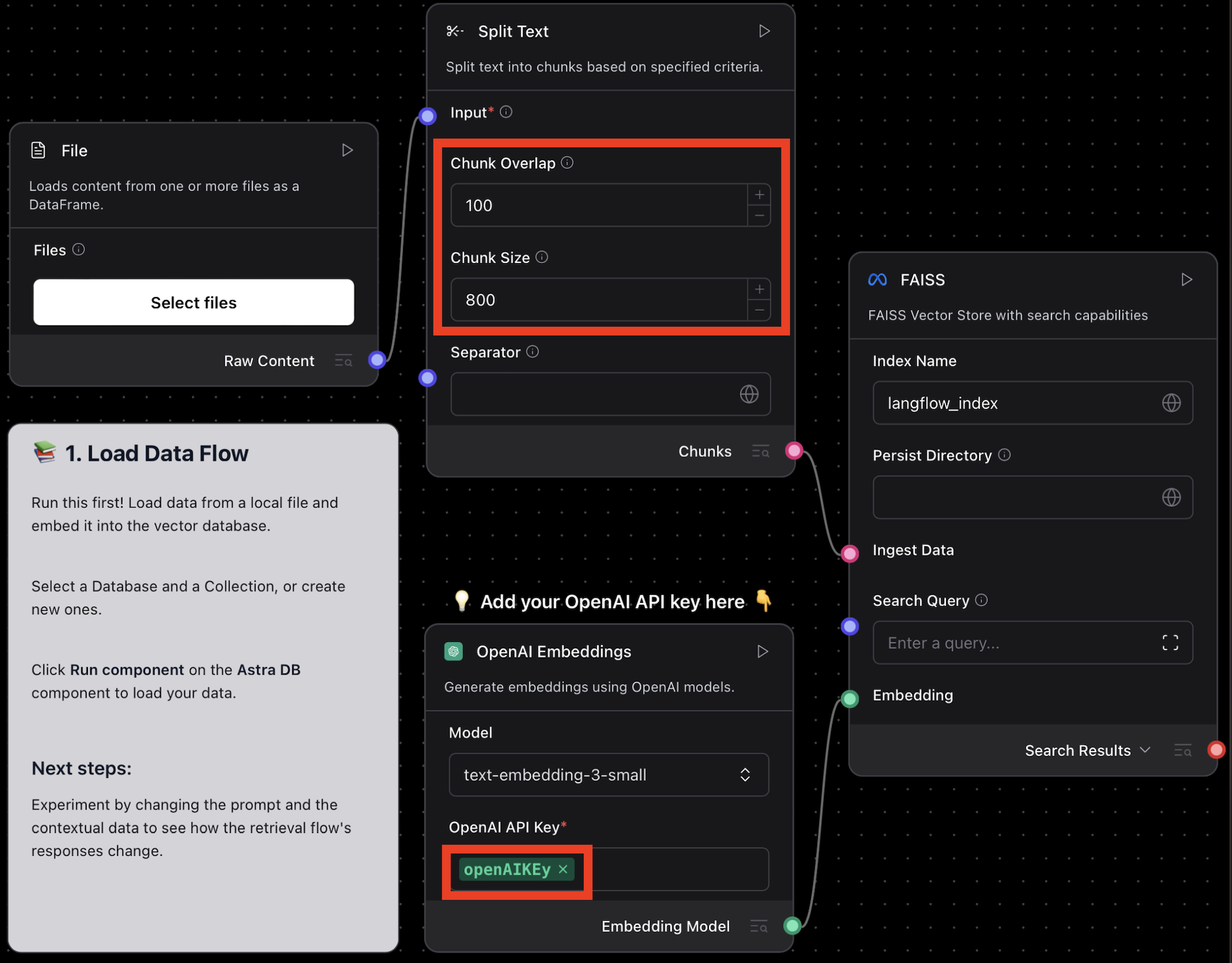 - Astra DB를 클릭하고 삭제 > FAISS로 대체하고 동일하게 Chunk > Ingest Data, Embedding Model 끼리 연결 해준다.