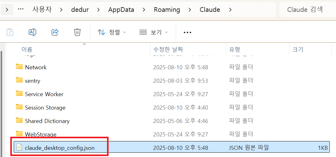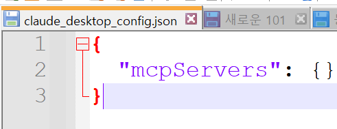 5) claude_desktop_config.json이라는 설정 파일이 생성된다. 문서 편집툴로 열어보자.