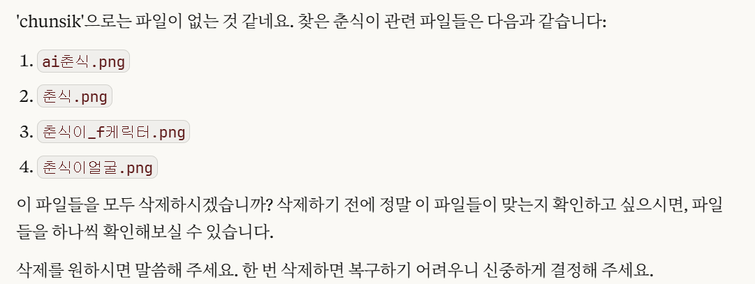 - delete file 기능은 보안상 만들진 않았나보다. ( 필요하면 직접 이 mcp 소스를 다운로드해서 커스터 마이징도 가능하다. )