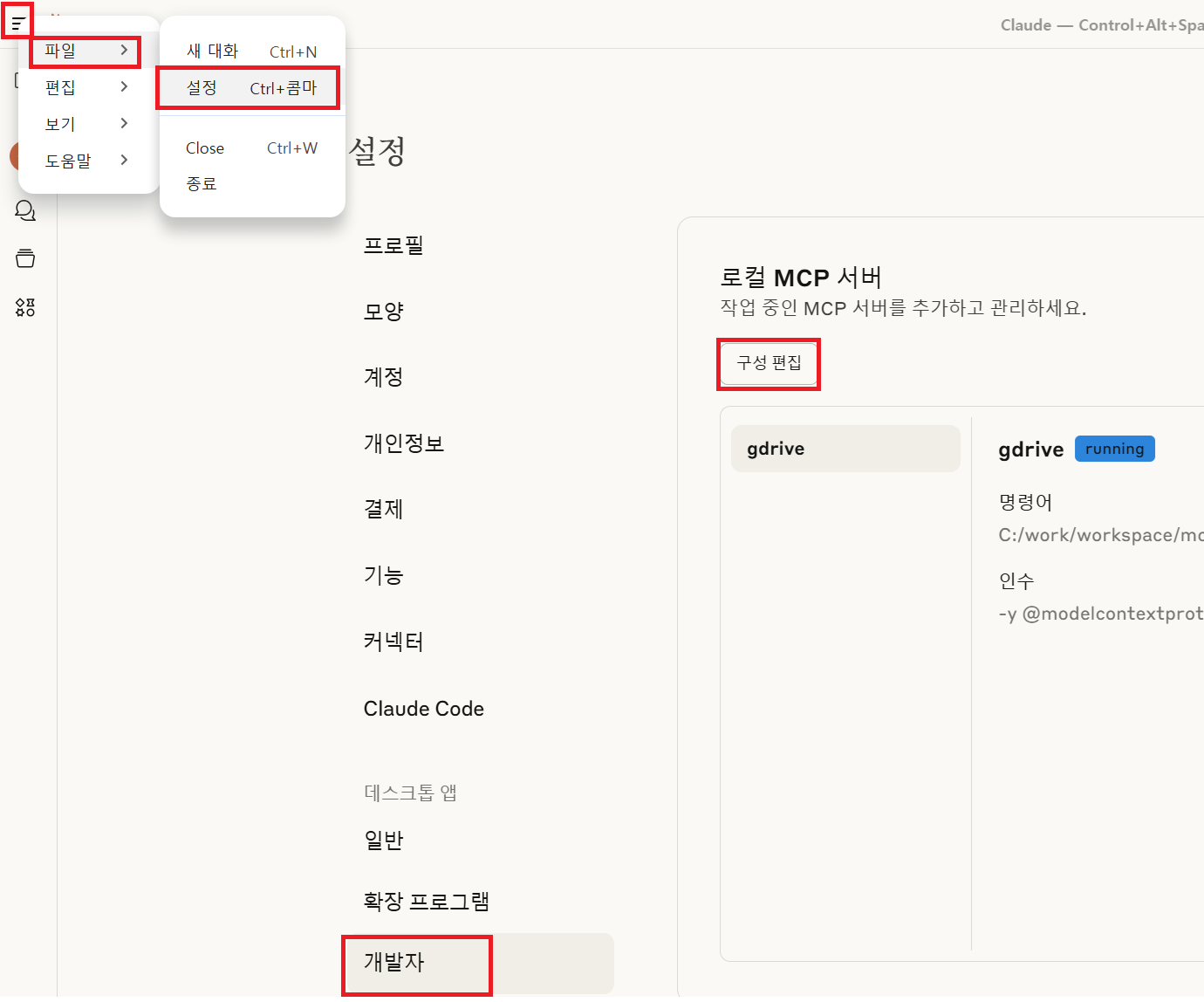 4) Claude Desktop 앱 실행 > 메뉴 > 파일(File) > 설정(Settings) > 개발자(Developer) > 구성편집(Edit Config) 클릭