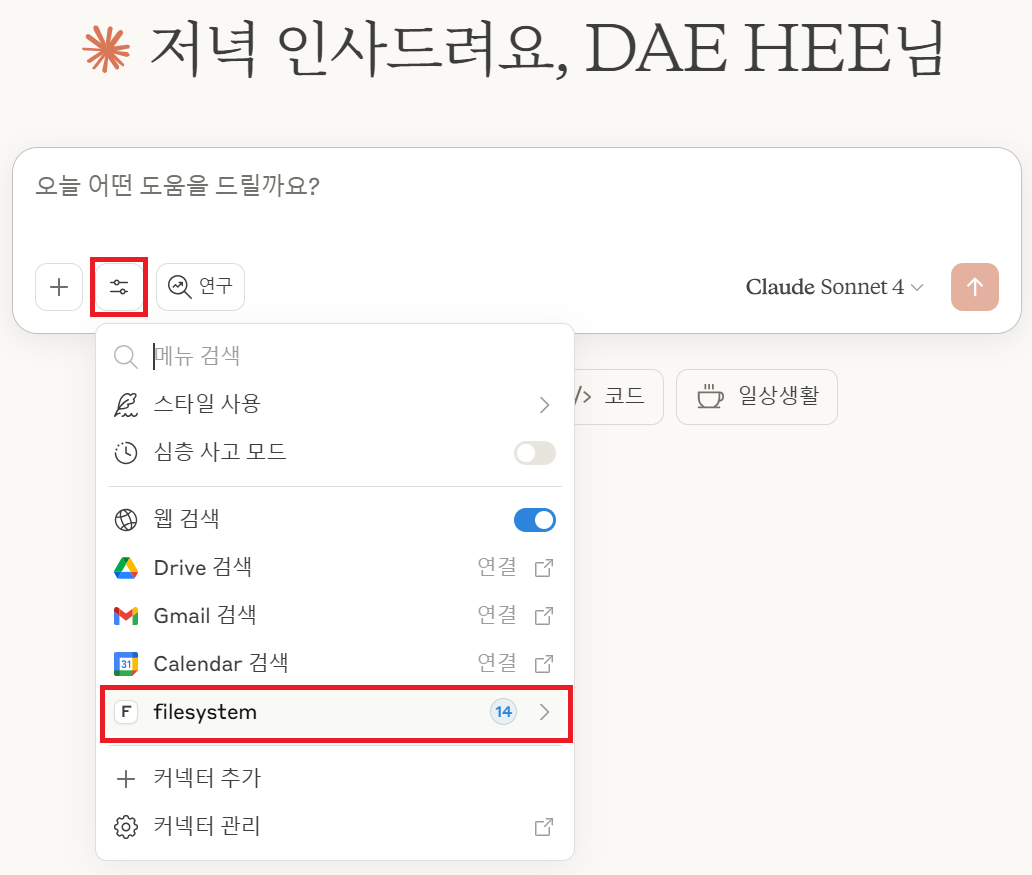 - 정상적으로 연동 되었다면, 새로운 채팅 > filesystem 이라는 새로운 도구가 연동된것을 볼 수 있다.